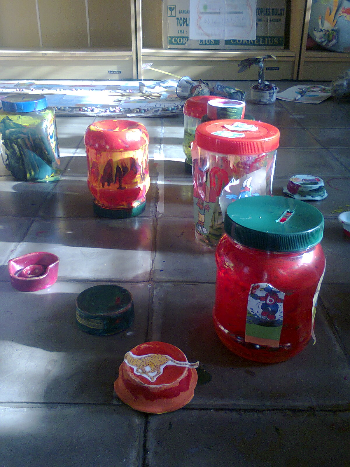 Anak-anak segera mengambil toples, memilih kuas, dan mulai mengecat begitu kegiatan praktek dimulai. Mereka saling bergantian menggunakan cat yang disediakan dan sabar memoleskan cat sebaik mungkin. Anak yang sudah selesai mengecat, boleh memilih tempat lilin dan menghiasnya menggunakan cat atau menempelkan gambar dengan lem sementara toples dikeringkan. Setelah cat yang menempel pada toples dirasa kering, anak-anak bisa menempel kertas bergambar atau membuat hiasan sendiri untuk mempercantik celengan dari toples tersebut.