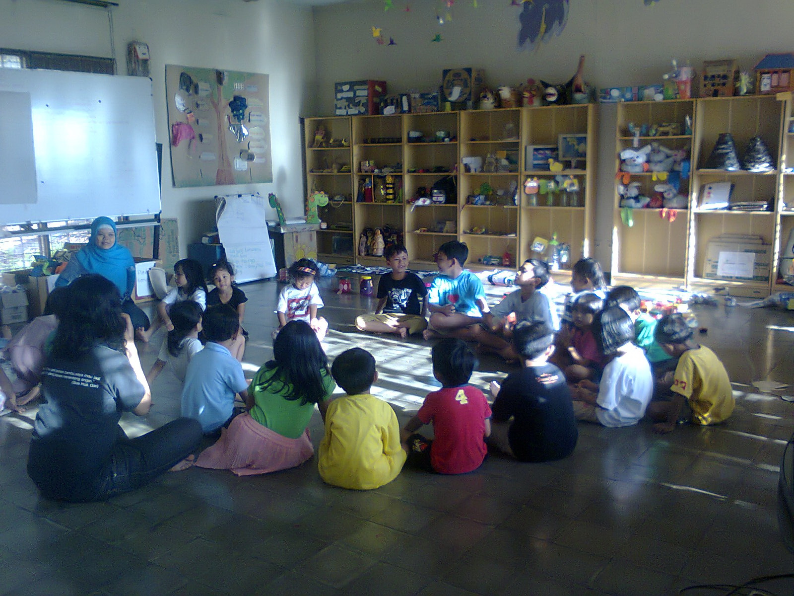 Hari Jumat 19 April, pukul 14.15 WIB anak-anak peserta art day mulai tiba di perpustakaan Reading Corner ECCD-RC. Mereka sangat menantikan kegiatan art day yang dilangsungkan setiap hari Jumat minggu ketiga setiap bulannya. 15 menit kemudian, anak-anak diajak ke gallery APE. Di sana mereka saling bertukar cerita sambil menunggu kedatangan teman yang lain.