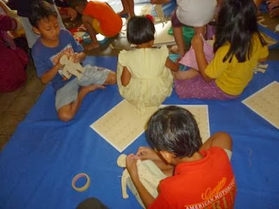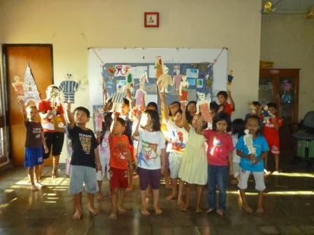 teman teman kecil ini, membuat wayang dengan menggunakan barang bekas lho. yaitu kertas bekas dan juga kain perca yang sudah tidak terpakai.