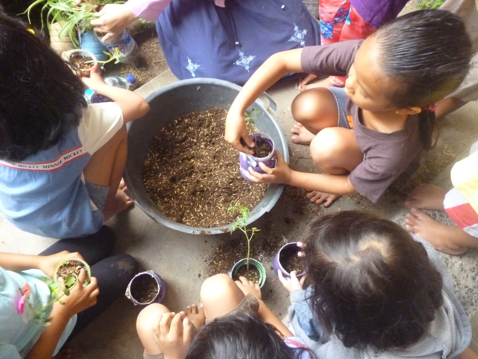 Anak-anak bersemangat sekali ingin ikut membuat udara lebih segar dengan menanam banyak tanaman. Mereka pun mulai menghias pot tanaman yang akan mereka gunakan untuk menanam pohon. Pot tanaman yang telah selesai mereka hias, bisa langsung digunakan untuk menanam pohon bersama-sama di sini. Ada yang menanam cabai, tomat, sensiviera dan tanaman hias lainnya. Diakhir acara anak-anak juga bersepakat untuk selalu menjaga dan merawat tanaman yang telah mereka tanam. Semoga dengan kegiatan ini kita bisa membantu membuat udara lebih segar.