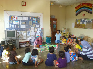 Kegiatan art day kali ini berbeda dengan kegiatan art day bulan lalu, karena ada kegiatan mendongeng tentang pohon oleh mbak Tantri (fasilitator art day). Nah saat mendongeng ini, Mbak Tantri bercerita tentang dua orang anak yaitu Dono dan Dini. Mereka merasakan perbedaan ketika melewati jalan yang banyak pohonnya dan jalan yang tidak ada pohonnya sama sekali. Ketika melewati jalan yang banyak pohonnya, mereka merasakan udara yang lebih segar. Sedangkan ketika melewati jalan yang tak ada pohonnya dan banyak asap kendaraan, mereka merasakan udara yang panas dan bau. Mbak Tantri mengakhiri cerita dongeng dengan mengajak anak anak untuk ikut menanam pohon membantu Dono dan Dini yang ingin membuat udara lebih segar dengan menanam pohon di sekitar rumah mereka.