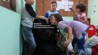 Di sudut lain, ada yang sedang menggambar dan bercerita. Mereka tidak berebut bicaranya karena harus saling mendengarkan satu sama lain. Jika ada yang berbicara maka lainnya mendengarkan dengan seksama.
