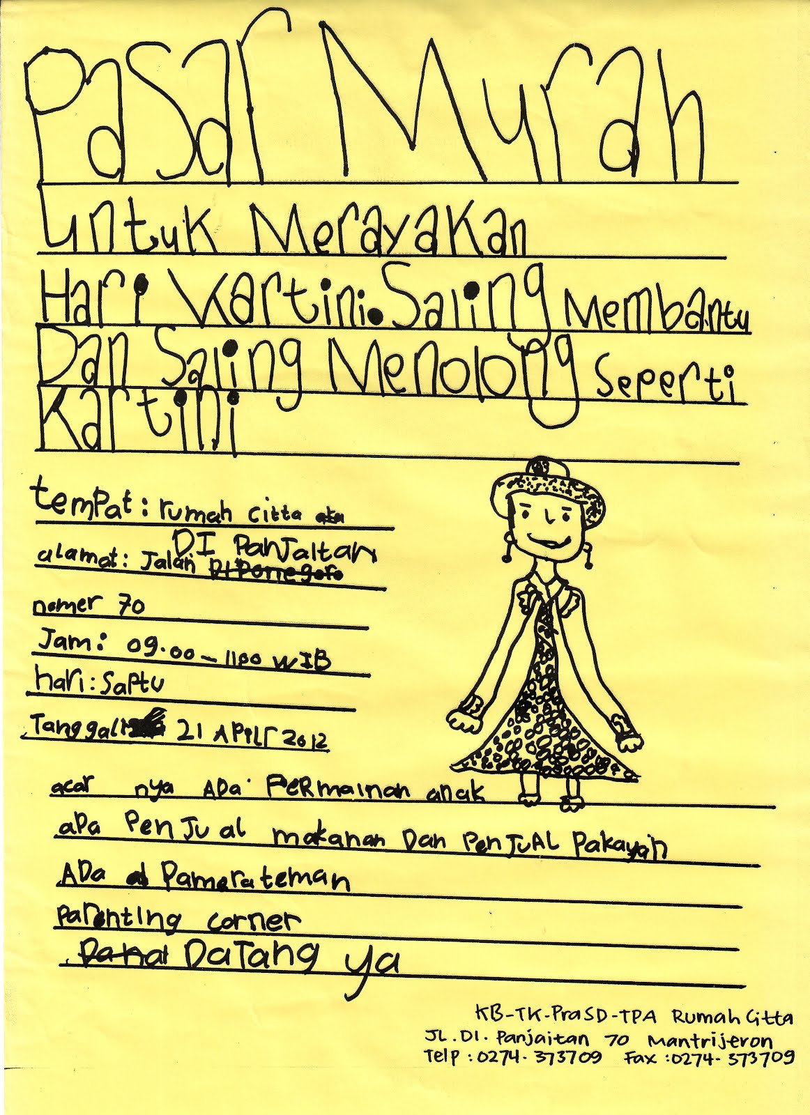 halo teman teman…besok sabtu, tanggal 21 APril 2012, pukul 09.00 – 11.00, LS Rumah Citta mau merayakan hari Kartini lho. tema besar kali ini adalah “saling membantu dan saling menolong seperti kartini” . agenda utama adalah pasar murah yang nantinya kami akan menjual sembako dengan harga murah (dengan kupon), untuk pihak yang membutuhkan. disamping itu, ada agenda yang mendampingi yaitu :